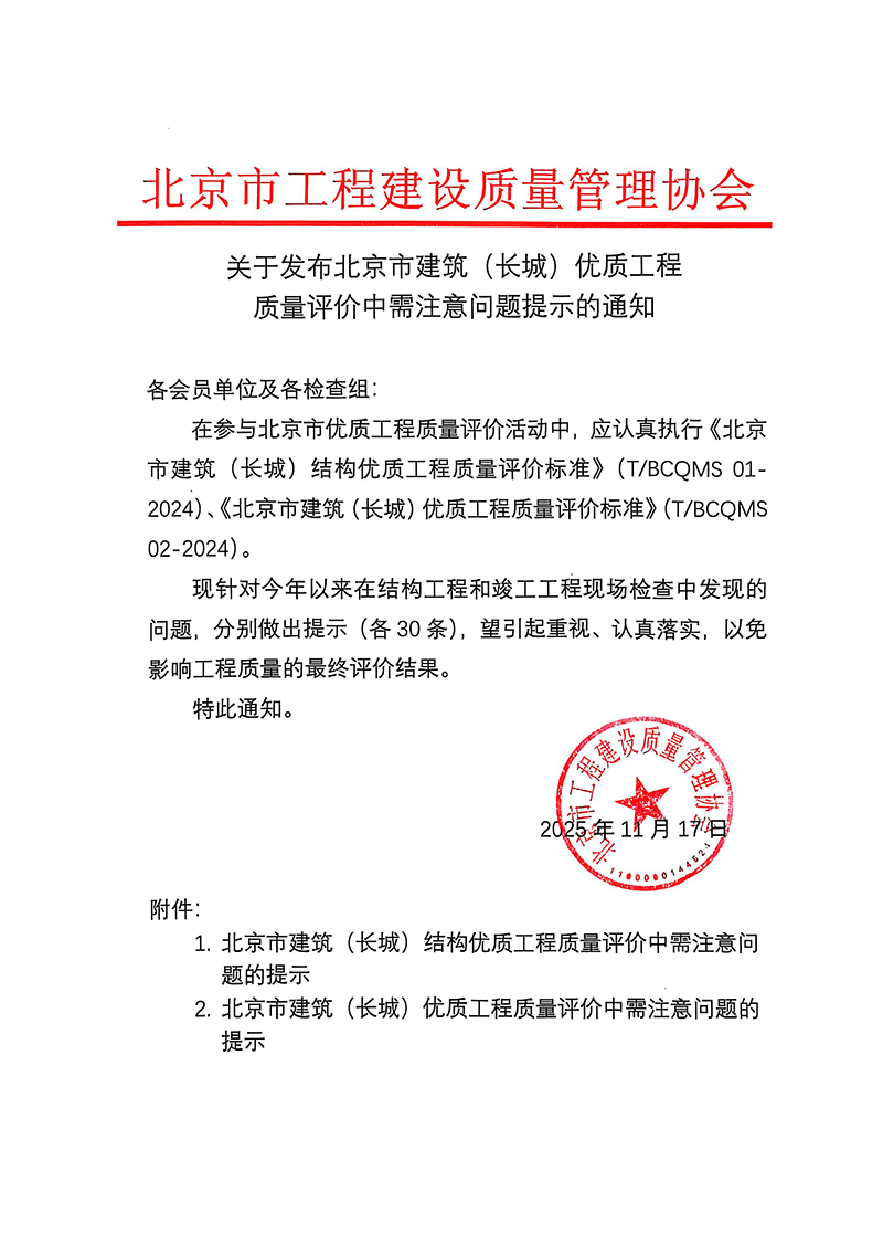 关于发布北京市建筑(长城)优质工程质量评价中需注意问题提示的通知